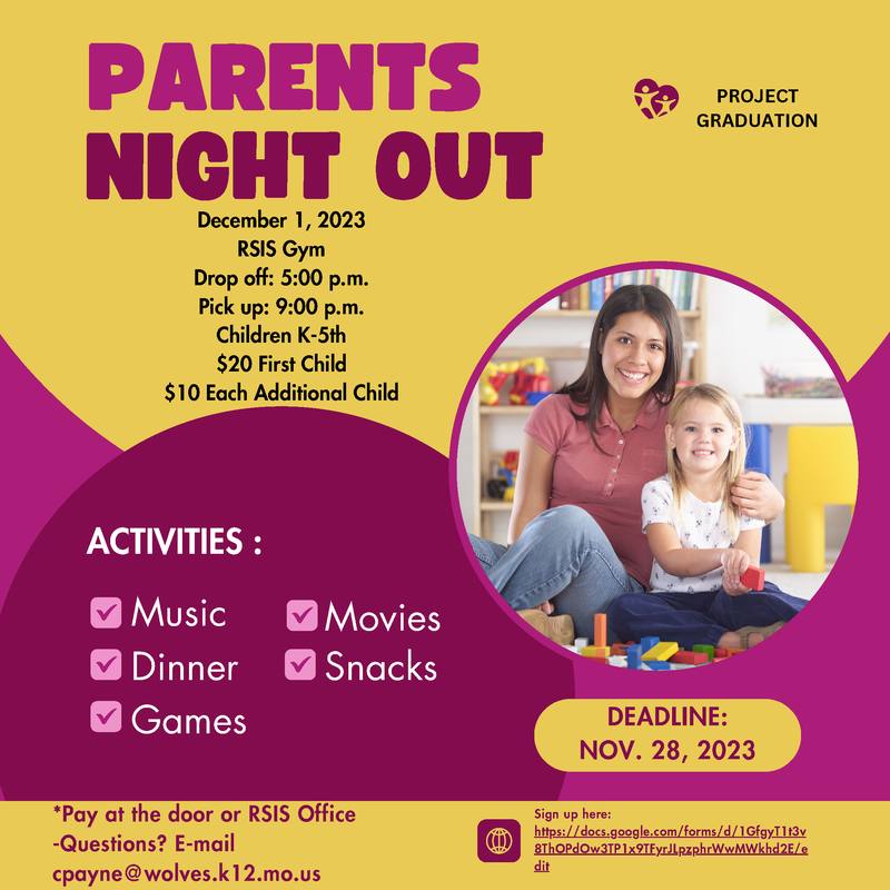 Project Graduation is offering Parents Nights Out on Friday, December 1. Parents with kids in grades K-5 can drop off their kids at the Intermediate School.