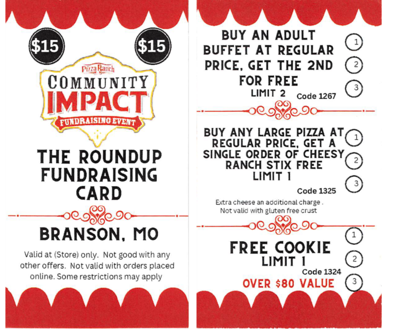 The group is selling Pizza Ranch discount cards for $15. You can get $100 worth of food!